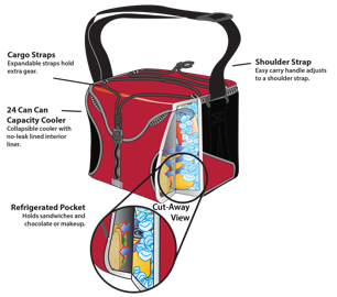 Our 24 can cooler is great for use as a personal size cooler for a couple of people or small family on a day outing. It’s large enough for 2-liter or wine bottles. It collapses down for easy storage so it’s ideal to pack away in your suit case for travel. It has a special refrigerated pocket to keep items cool and dry.