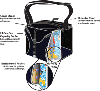 Expandable cargo straps allow for carrying extra gear. A separate compartment stores the collapsible grill. Constructed of strong 600 denier polyester fabric it’s stain resistant for easy care.