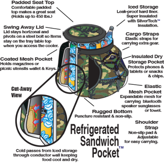 Third, the unique Refrigerated Pocket keeps your sandwiches, meat for grill’n or cheeses cool & dry and protects them from spoiling. Since they’re kept separate from the ice compartment you’re not burning through ice at the same rate as if they were in the main compartment and not opening the main compartment when you’re accessing them.