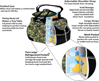 Our Coolest Coolers are the only coolers with iced, refrigerated and dry storage so they provide for all your food storage needs. The two extra large unique Refrigerated Pockets keep your sandwiches, meat for grill’n or cheeses cool & dry. You can also stock the side pockets with 12 extra cans in each if you’re on an all liquid diet! The mesh dry pocket holds your smart phones or can be used to hold wallet, glasses etc.