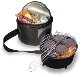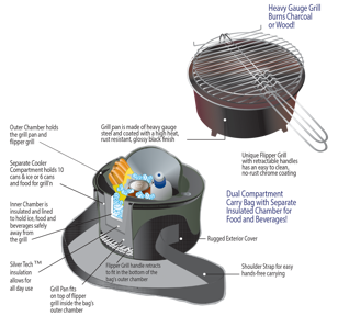 The Original GrillnChill combination boasts a grill that fits in a duel chamber cooler and grill carry bag.