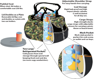 The padded top makes a comfortable seat holding up to 250 lbs. When you’re not sitting on the cooler you can use the cooler as a side table to your chair since the lid since the lid flips over to reveal a tray that rests on top of the cooler. The lid can also be used as a plate with two holders for cans. The padded shoulder strap adjusts so you can also use it as a handle.