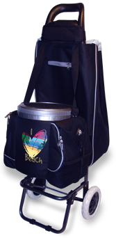 Our Coolest Trolley is designed to hold all your gear in addition to your cooler.  The 18 cooler hangs on trolley and swings down to hold beach blanket and chairs.