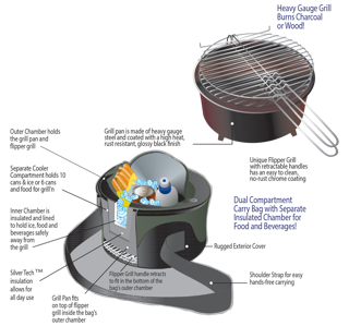 The 10 can cooler can be used to chill meat for grilling or beverages. Long wide should strap for easy hands-free carrying. Why settle for a cold sandwich when grilling on the go has never been this easy!